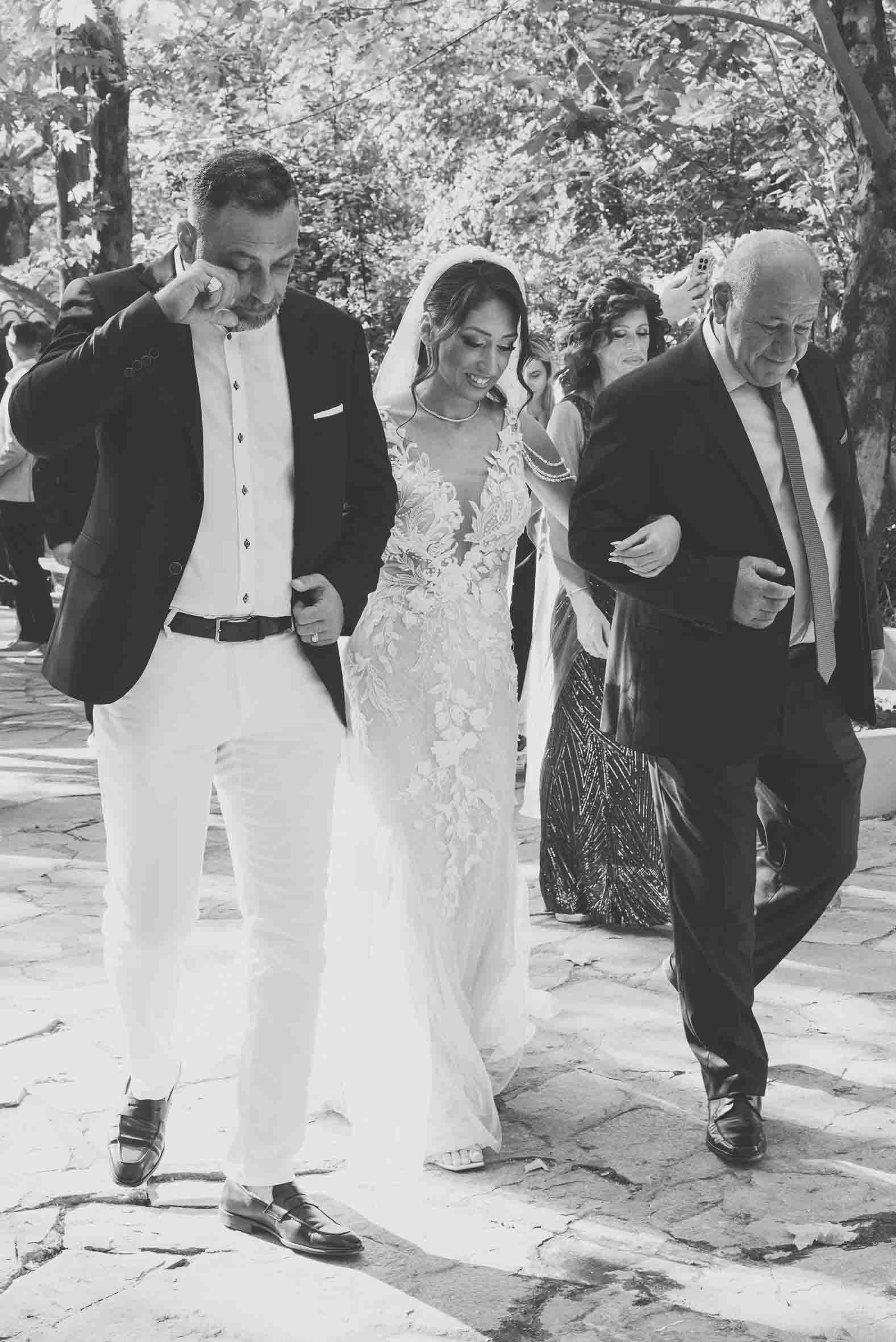 Η τελετή έγινε στο Αγίασμα Τιμίου Προδρόμου στην Ευκαρπία Θεσσαλονίκης, ένα μικρό εκκλησάκι γεμάτο φως και γαλήνη. Ο Κώστας και η Πένυ κοιτούσαν ο ένας τον άλλον με εκείνο το βλέμμα που λέει τα πάντα χωρίς λόγια. Οι φωτογραφίες από εκείνη τη στιγμή έχουν αυτή τη χαρακτηριστική ρομαντική ηρεμία που αγαπώ να αποτυπώνω στους γάμους.