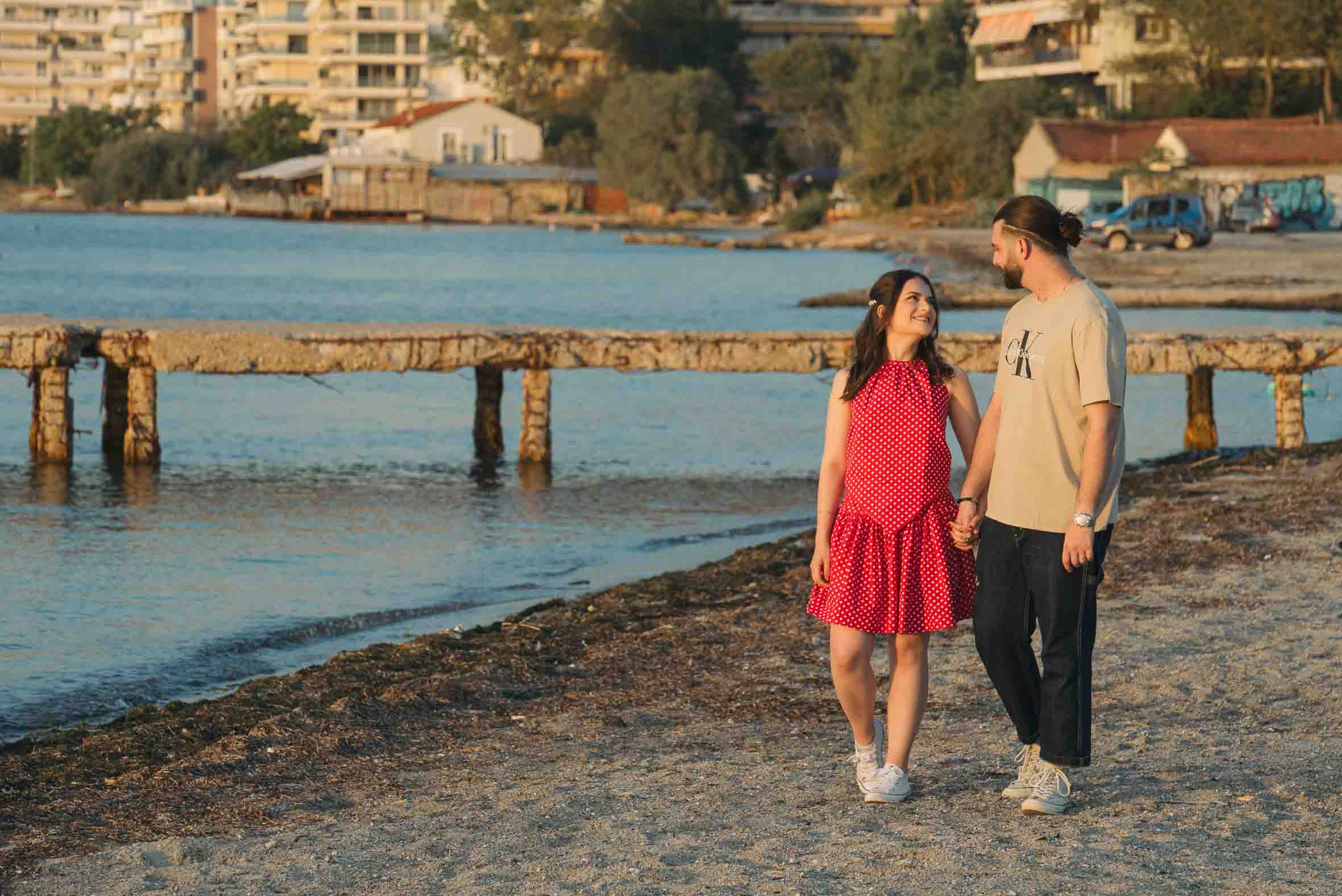 Η θάλασσα και ο ουρανός συνέθεσαν το τέλειο σκηνικό, επιτρέποντάς μας να αποτυπώσουμε την αυθεντική ομορφιά της σχέσης τους. Καθώς ο ήλιος βυθιζόταν στον Θερμαϊκό, ο Θανάσης και η Χαρίκλεια απόλαυσαν μια χαλαρή βόλτα δίπλα στο κύμα, χαρίζοντάς μας αυθόρμητα στιγμιότυπα. Επιπλέον, η ηρεμία του τοπίου βοήθησε το ζευγάρι να εκφραστεί ελεύθερα, αναδεικνύοντας τη χημεία του σε κάθε λήψη.